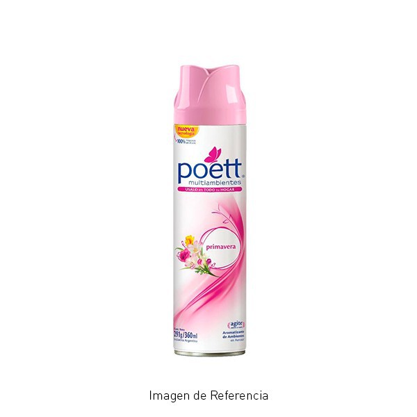 Marca: Poett Uso: Limpieza del Hogar Tipo: Desodorante Ambiental Spray Tamaño: 360 cc Aroma: Primavera Precauciones: Mantener fuera del alcance de los niños. Guardar en lugar fresco y seco.